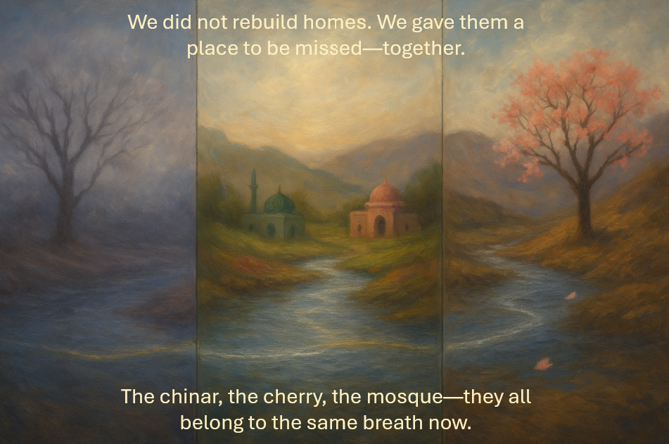 In Srinagar, the courtyard canopy fluttered like a lung after a long-held breath. Aisha unrolled the final canvas panel — the Srinagar sky now complete with a chinar’s ghost in violet, its branches dissolving into mist. In Jammu, Neelam had finished the valley floor: a silver river cradling mosques and temples in soft rose and emerald, their doors open to no one.
