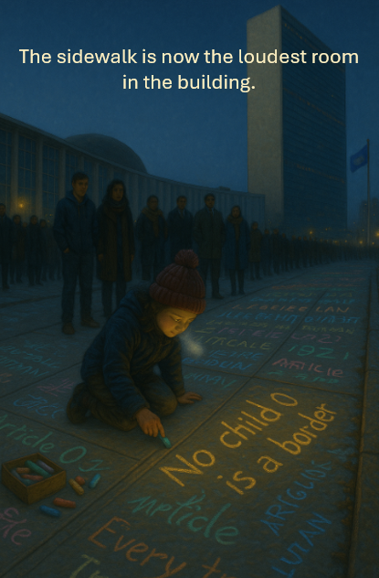 For three days after the breath-vote, tourists, diplomats, cafeteria workers, exhausted interns, and journalists kept gathering on the plaza and sidewalks in front of the Secretariat tower. Something about the frozen concrete felt like it was waiting—waiting for someone to say the next true thing.