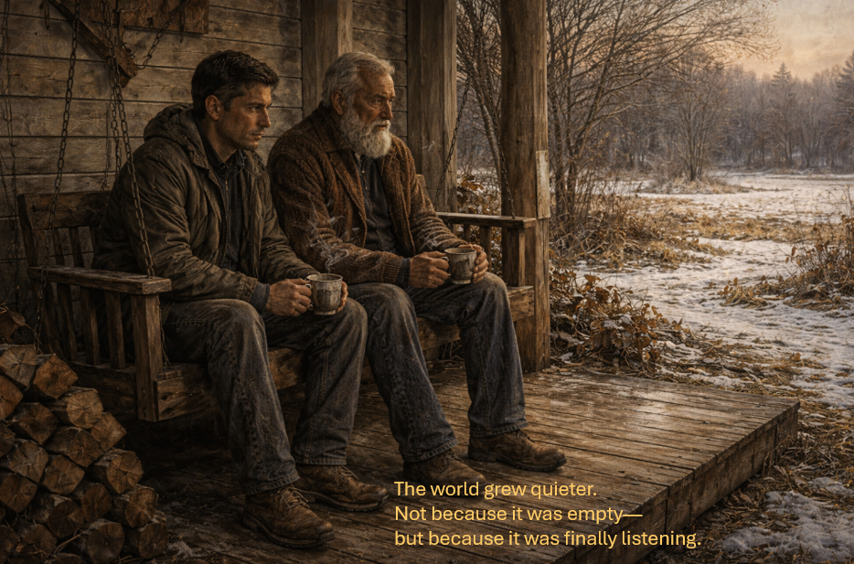 Location: Thomas’s porch— the same house, the same creaking swing, the same smell of old wood and cold earth