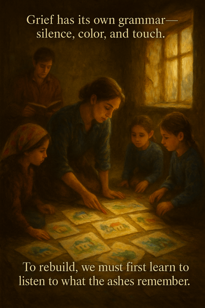 Children’s memories re-emerge through fragments of pre-war drawings; grief transforms into creative dialogue. Emotional expressions shift from silence to shared participation. Trust deepening; grief becoming communicable.