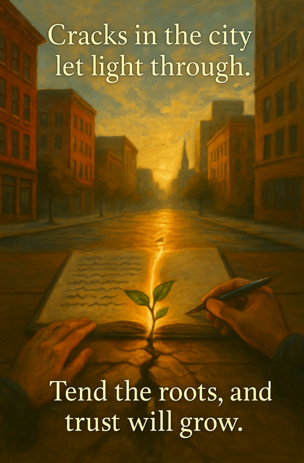 The air in East Riverton carried the bite of late October, sharp with the scent of damp concrete and fading leaves. The Circle of Seeds stood before a scarred wall, their mural board freshly mounted, its blank canvas a fragile hope against the neighborhood’s graffiti-streaked defiance. Emil adjusted the seedling tray—basil and beans trembling in […]
